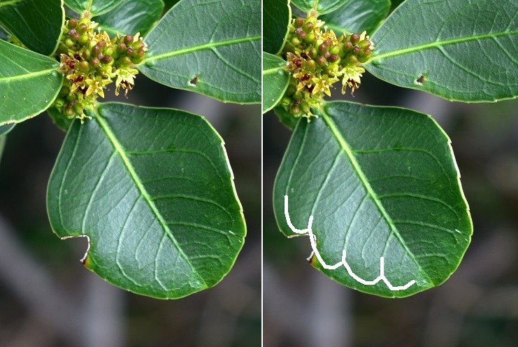 Vista quasi zenitale, si distinguono ampi spazi fra i rami. Febbraio.Stesso mese, in un tepido tramonto alla foce del Guadalquivir presso Sanlucar de Barrameda (Andalusia).A volte può avere anche un aspetto più composto con chioma raccolta e fitta, come in questo alberello del Jardin des Plantes di Parigi. Settembre.La cosa che più colpisce di questa pianta è la foglia. Primariamente per la forma, ché varia grandemente da allungata con vertice e base acuti a quasi circolare.Ci sono poi le nervature che hanno la peculiarità di essere in rilievo su entrambe le facce. Anche il loro percorso è singolare: corrono lungo il bordo assecondandone il profilo, come per accentuarne i capricci.