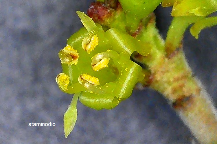 Ma le singolarità non sono finite, poiché la foglia esibisce una curiosa banda chiara (dello stesso colore della pagina inferiore) che corre lungo tutto il bordo. Il quale bordo, poi, può presentarsi quasi intero o con piccoli denti ottusi o addirittura seghettato. In corrispondenza degli apici dei denti si trovano minuscole ghiandole.La fillotassi, come si è detto, è alterna, ma molto irregolare.I rametti sono grigiorossicci e, da adulti, glabri. Pelosi da giovinetti.Fiorisce già in febbraio, a Padova non prima di metà marzo, e va avanti fino a tutto aprile. Piccoli fioretti gialloverdognoli raccolti in mazzolini che spuntano dalle ascelle delle foglie, ma solo verso la cime dei rametti.Fiori senza corolla, cinque sepali e calice che forma un tutt’uno col peduncolo. Del colore si è detto, ma isolando i fiori dalle foglie non si è poi tanto sicuri che a prevalere sia il giallo o il verde.I fiori sono unisessuali. In quelli maschili i sepali sono ripiegati all’indietro e ai cinque stami si alternano staminodii (stami sterili)Non avendo ancora una foto del fiore femminile, Unalberoalgiorno ha pensato bene di disegnarsene uno. Pistillo con tre stili sormontati da stigmi bifidi; presenza di staminodi come per il fiore maschile; sepali spiegati e non retroflessi come in quello. Frutti: piccole sfere brillanti, inizialmente rossoviolacei poi neri con riflessi bluastri. Si tratta di drupe con più semi. Gli splendidi colori dei frutti in maturazione.A volte numerosissimi.