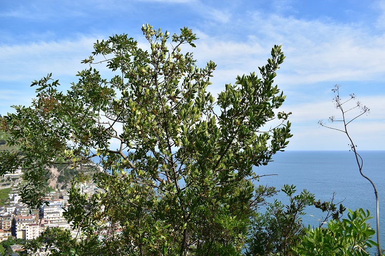 Il Nostro circondato a sinistra da Phyllirea latifolia e a destra da un grande Viburnum tinus; lo sovrasta un Juniperus communis.Una formazione di alaterni, oltre un muretto a secco, presso la Torre dello Ziro (Amalfi, Salerno). Dietro sughere, con le loro chiome chiare, più in alto pini (forse Pinus brutia, per alcuni una sottospecie dell’halepensis) e a destra, miracolosamente abbarbicati alla parete rocciosa, cipressi. In primo piano il muretto e dietro le cime scompigliate degli alaterni.Da questo luogo il panorama sugli aspri promontori e il mare è superbo. Ma una visione colpisce il Cacciatore di Alberi che dietro l’ennesimo alaterno scorge una veduta di Atrani della quale ha un vago ricordo… …Ma certo!: Escher l’ha riprodotta in un suo famosissimo disegno.Esemplare di Rhamus alaternus lungo il Sentiero dei Limoni (Maiori, Salerno).Corteccia liscia, dal colore grigio appena arrossato.