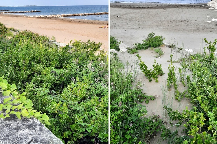 Folta formazione ai Giardini TrevesFazzoletto di giardino a Venezia sulla fondamenta della Chiesa di Sant’Andrea.Sotto il Salone (Palazzo della Ragione, Padova). Nella foto la cultivar E. j. LivorneseFoglia allungata, vertice ottuso o arrotondato, base acuta. Coriacea al tatto.Colore verde intenso, più chiara la pagina inferiore. Bordo intero alla base, seghettato in alto a denti quasi arrotondati.Fillotassi opposta con le coppie di foglie sfalsate ad angolo retto. Giovani rametti verdi.La corteccia comincia a ingrigire, quasi annerire, dalle creste, lasciando i solchi ancora verdi.Poi col tempo tutto si arrossa, ma il colore di base resta molto scuro. Difficile riprenderla tra i numerosi rami e il fitto del fogliame.In giugno la pianta si ricopre di fioretti gialloverde così fitti da fargli cambiare colore. Lido di Venezia, Via Hertz. Infiorescenza dalla particolare struttura posta in cima ai ramettiIl termine tecnico è cimosa bipara. Un fiore è posto, sul suo peduncolo, nella direzione dell’asse del rametto mentre dallo stesso punto partono due diramazioni laterali; il modulo si ripete poi uguale a se stesso su queste ultime; e poi ancora e ancora quasi come in una struttura frattale.I singoli fioretti, bisessuali, hanno simmetria quaternaria e quattro sono pure gli stami, alternati ai petali. Al centro un unico pistillo si erge turgido e diritto (anch’esso, come vedremo, si fa in quattro).I colori brillanti, la consistenza quasi gommosa, le superficie levigate danno al tutto parvenza di porcellana.Petali saldati alla baseAnaloga sorte per i sepali. Il colore del calice propende verso il verde chiaro.Ovario supero, corto stiloStigma quadripartito (quattro carpelli)Sezione trasversale dell’ovario; quattro loculiAntera con due sacche pollinicheFiore appena fecondato in luglio. Si distinguono le suture della capsula che verrà.La quale capsula in settembre comincia a scurirsi incerta fra il rosa e il marronePoi in dicembre emergono i semi ricoperti da una sorta di arillo rossissimo.Rimangono a lungo sulla pianta, facendola somigliare molto (e pericolosamente…) al pitosforo.E allora la chioma cambia ancora colore arrossandosi alquanto.La specie si è completamente naturalizzata. Foto: Murazzi al Lido fra pitosfori e canne.Verso la spiaggia, in competizione con dune in formazione.