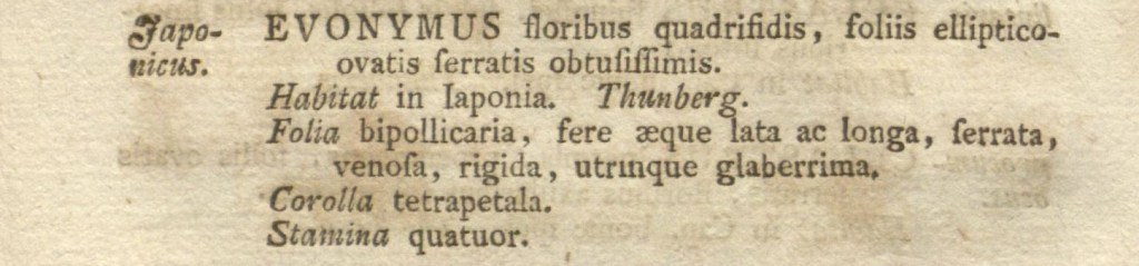 Euonymus japonicus Thunb. Nome assegnato da Carl Peter Thunberg (allievo di Linneo all’università di Uppsala) nel volume del 1780 dei Nova acta Regiae Societatis Scientiarum Upsaliensis. Thunberg ha studiato nei paesi di origine sia la flora africana sia quella giapponese, pubblicando numerosi volumi sulle specie di quelle regioni. Uomo dalla storia lunga e affascinante tanto che se ne potrebbe fare un film.