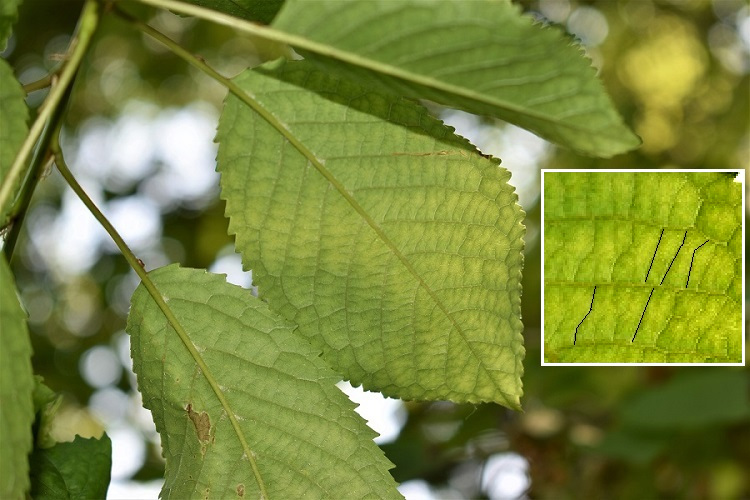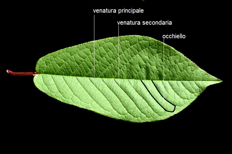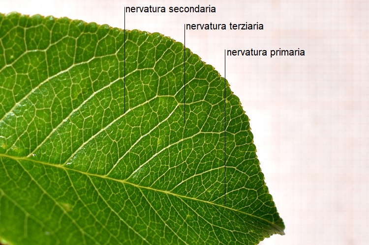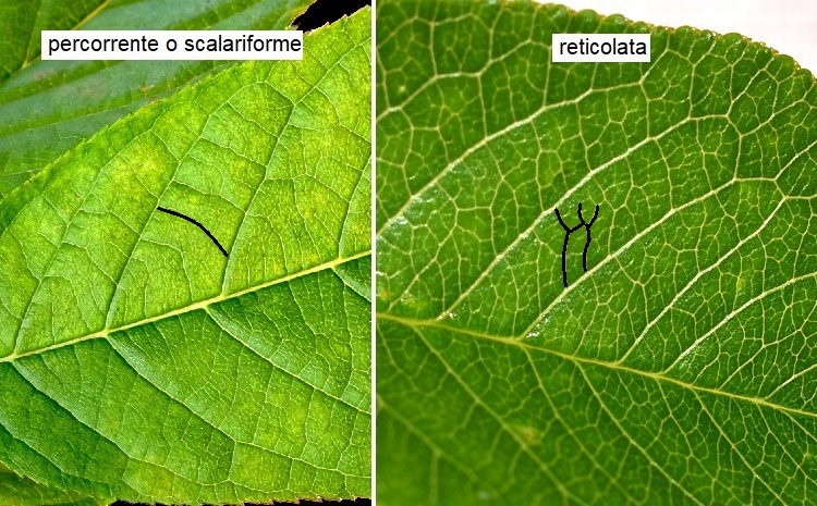 …inoltre presentano venature (o nervature) secondarie pennate, come i denti di un pettine. Queste non arrivano dritte al bordo ma si piegano connettendosi alle vicine e formando occhielli allungati. (Foto: Prunus padus)Dalle venature secondarie si dipartono ulteriori condotti, le venature terziarie o del terzo ordine, che forniscono criteri utili al riconoscimento. (Foto: Prunus mahaleb)Quando le terziarie connettono direttamente le secondarie fra loro, si originano disegni a forma di scala (forma percorrente o scalariforme), se invece si orientano in direzioni diverse, il loro tracciato assume forma di rete (reticolata). (Foto: Prunus maackii a sinistra, P. mahaleb a destra)