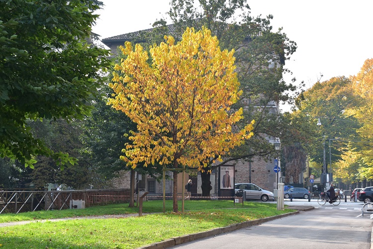 La corteccia rossoaranciata, quando invecchia scurisce a cade in squame cartacee (carattere risolutivo). Infiorescenze vaporose complici i lunghi e sottili stami.Dopo di ciò quasi inutile soffermarsi sulle nervature terziarie a forma percorrente e ben visibili sulle due pagine.Giovane esemplare in Via Aviano. In autunno si accende di gialloarancio.