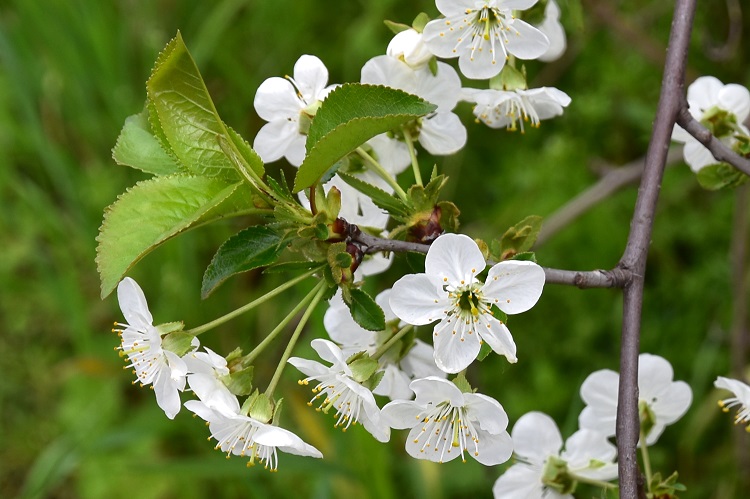 Giovane cerasus dell’Orto, vive addossato al muro di cinta presso la Porta est.Siepe campestre, località Rizza (Comune di Verona).Un frutteto a Torreglia (PD).Foglia allungata, base ottusa o appiattita, vertice acuto e sporgente, bordo finemente seghettato. Fillotassi alterna.Lamina lavorata a sbalzo, picciolo corto di colore amaranto.Pagina superiore verde scuro, inferiore molto più chiara con nervature evidenti.Ghiandole, canoniche, in prossimità della lamina. Fiori candidi e numerosiDisposti a mazzolini di pochi fiori. Peduncolo lungo, cinque petali e altrettanti sepali……ripiegatiStipole dalla corta peluria. Numerosi stami, esili e sporgenti dalla corolla. Antere giallo ocra. Un unico pistillo alto e slanciato a stigma giallognolo.Un piacere osservare i rami colorati a pastello complici le giovani foglie.Ovario supero e tanto nettare in fondo al caliceVisibile la sutura della foglia trasformata in pistillo (carpello)Fin su allo stigma.Le ciliegie sono poco più piccole di quelle dell’avium. Hanno un lungo picciolo, pelle sottile e polpa acquosa e acidula.Maturano in maggio.Rametti grigiobruni piuttosto lucidiLa corteccia conserva il colore dei rametti ma vira al rosso. Numerose lenticelle disposte in strisce circolari che imitano l’avium, ma il colore è discriminante.Pianta importante nella produzione agroalimentare. Nella foto, Torreglia ai piedi dei Colli, un appezzamento per la coltivazione del Marasco. La disposizione degli alberi è ai vertici di rettangoli di cinque per quattro metri (tecnicamente: sesto d’impianto).Ovviamente piante selezionate per una abbondante produzione. Oltre al Marasco altre famose cultivar sono Amareno e Visciolo. Ed eccole allineate mentre compiono diligentemente il loro lavoro.