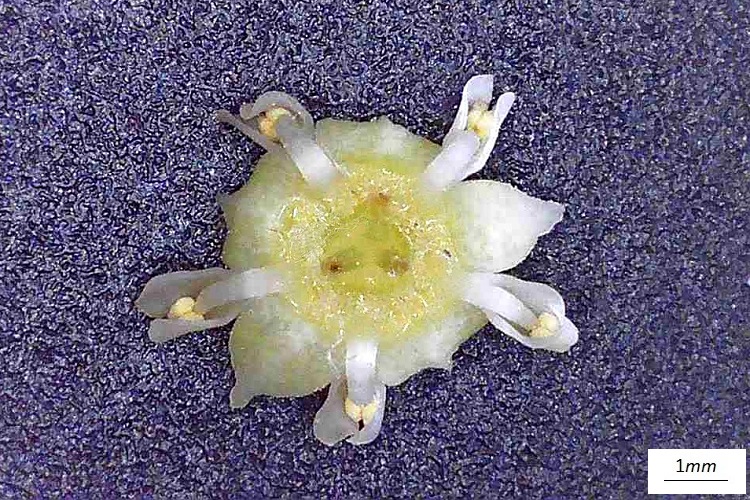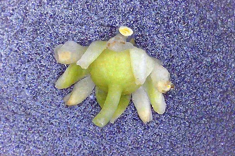 Per orientarsi nella complessa struttura del fiore conviene aiutarsi con un disegno (diagramma fiorale). Lungo il cerchio più esterno sono raffigurate le sezioni dei cinque sepali; seguono i petali i cui spaccati danno luogo alle strane forme a ‘C’, all’interno delle quali sono tracciate le recisioni delle antere. Fin qui il fiore ha simmetria pentagonale, diventa ternaria proseguendo verso il centro. Per primo troviamo l’ovario, di cui in questo gioco di troncamenti è mostrata la parte più bassa, si distinguono tre giunzioni le quali più in alto daranno luogo ai tre stili separati; al mezzo della figura, infine, le sezioni dei tre ovuli. La regine gialla è il vasto nettario.