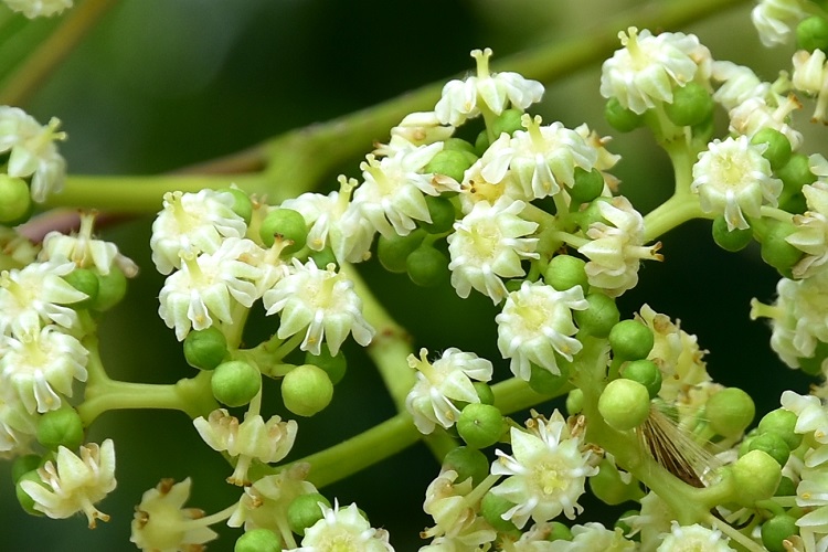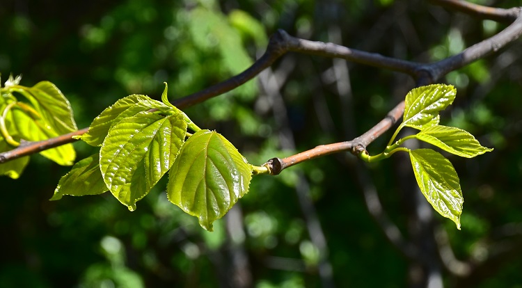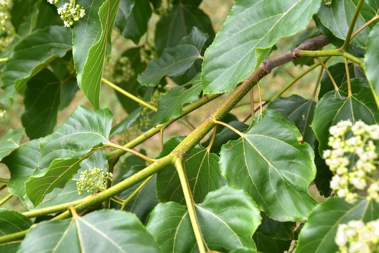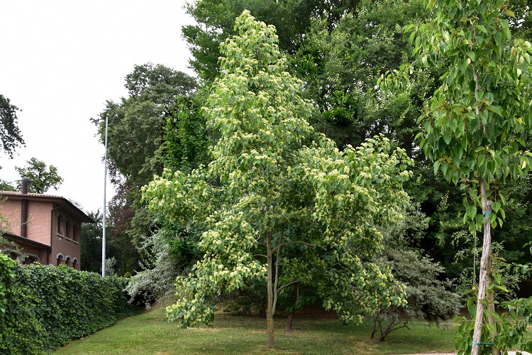 Il verde tenue delle foglie nuove (inizio maggio) risalta sulla vegetazione retrostante. Si distinguono i rami più bassi quasi orizzontali.Foglia a lamina ampia, base arrotondata (per i manuali anche cordata), vertice acuto finanche acuminato. Colore (foto in maggio) verde smeraldo… …poi si scurisce e diventa quasi cupo. Niente foliage, le foglie sembrano aver fretta di cadere e non aspettano neanche d’ingiallire per farlo.Appena spuntate sono bronzee e lucidissime. Bordo dentato, picciolo proporzionato, fillotassi alterna. Foglia liscia al tatto su entrambe le pagine, consistenza corposa che tende col tempo a diventare cartacea.Interessanti le nervature, le primarie sono tre e si dipartono dal picciolo, le due esterne hanno venature secondarie solo su un lato. Il colore è ocra verso il picciolo poi sfuma diventando gialloverde.Il curioso comportamento delle venature esterne si distingue bene nella foto. Vicino al bordo le secondarie formano occhielli. Fra giugno e luglio si ricopre completamente di estese infiorescenze tra il giallo e il verde, che sembrano piccoli cuscini adagiati sulle fronde.Le foglie si sono ormai scurite e l’effetto cromatico è accentuatoRiconoscere la forma dell’infiorescenza non è immediatoPiù facile con i boccioli: da un asse principale si diramano due assi secondari, poi lo schema si replica identico, ma mutando le direzioni di biforcazione. La cosa si ripete più volte e alla fine, su esili peduncoli, troviamo i fiori. Ancora più evidente in questa sorta di scheletro, rinvenuto sulla pianta all’inizio di ottobre. I singoli fioretti sono completi di calice e corolla. Stilo giallognolo e prominente, in alto si divide in tre con i rispettivi stigmi poco appariscenti.L’interno del ricettacolo è peloso. I sepali sono triangolari e al tatto carnosi. I petali (alternati ai sepali) avvolgono quasi interamente gli stami, come a proteggere le antere; carattere raro. Petali, filamenti e pagine superiori dei sepali bianchi e diafani. Ricettacolo tondeggiante e verdolino, lo stesso colore hanno le pagine inferiori dei sepali.Vista zenitale