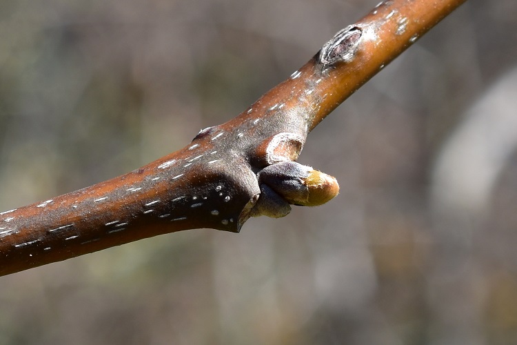 Ma il carattere più singolare della pianta sono queste strane formazioni dall’aspetto di galle, che compaiono alla fine dell’estate.In realtà si tratta degli steli delle infiorescenze che si ingrossano smisuratamente, dapprima verdi poi ambrati. Sono commestibili e hanno il sapore dell’uva passa, da qui il nome comune della pianta.I veri frutti sono minuscole capsule sferiche dal peduncolo ricurvo e terminante in un grazioso disco residuo del calice. Foto in agosto.OttobreNon sembra si aprano spontaneamenteL’involucro coriaceo ha tre valve ostiche da schiudere. All’interno tre semi a guisa di dischi. Al centro del seme di destra è visibile la cicatrice dell’articolato collegamento fra ovulo e ovario.Immagine astratta in aprile, con frutti e peduncoli dell’anno precedente. La corteccia è grigia e fessurata a coste (cioè con solchi sottili e creste larghe) come in certi tessuti di velluto.Invecchiando il carattere si accentua. Nella foto il tronco di un altro esemplare che vive in Orto, lo potrete trovare nel settore dedicato alla piante introdotte per la prima volta in Italia: il cartellino recita ‘1842’.Rametti inizialmente verdi poi marrone (nella foto si distingue bene la transizione fra i due colori) ricoperti di lenticelle bianche e allungate.Due robuste perule proteggono le gemme. Nella foto la schiusa in marzo.