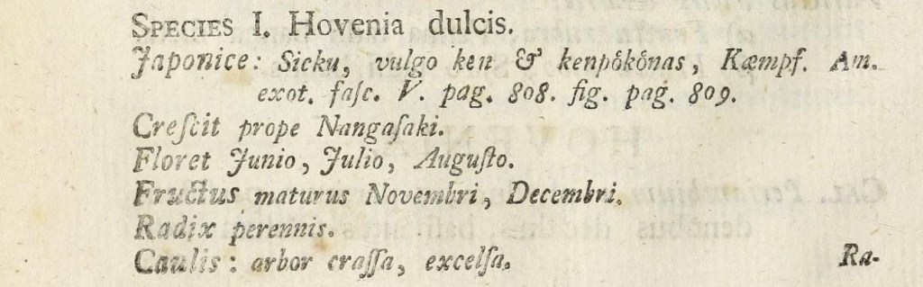 Hovenia dulcis Thunb. Il nome fu imposto da Carl P. Thunberg (allievo di Linneo all’università di Uppsala e poi suo successore) nella prima parte del volume del 1781 dei Nova Genera Plantarum. Thunberg ha studiato nei paesi di origine sia la flora sudafricana sia quella giapponese.