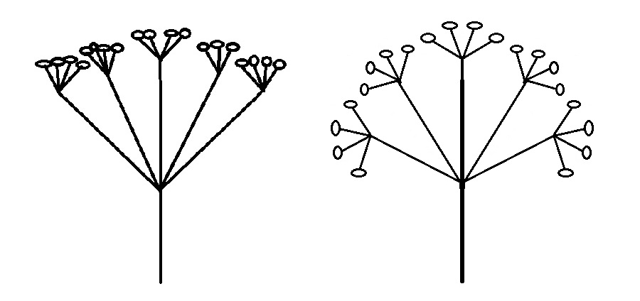 Le foglie sono lobate e ogni lobo è grossolanamente dentato; pagina inferiore con nervature evidenti.Una corona di bianchissimi fiori sterili racchiude piccoli fioretti fertili biancocrema. Carattere dirimente. L’opulus ha una famosissima cultivar, V. o. Flore Pleno, che lo sostituisce alla grande nei giardini, e a guardare la foto si capisce perché.Il profilo dell’infiorescenza (ombrella composta)del lantana e del Flore Plenosomiglia di più allo schema a destra, mentre quello a sinistra sembra meglio adatto a descrivere le infiorescenze degli altri viburni.Le infiorescenze in lontananza assomigliano molto a quelle del lantana. Ma avvicinandosi le corolle dei singoli fioretti si rivelano formate da quattro petali distinti, mentre quelle del lantana hanno forma ad imbuto. Personalmente preferisco la fioritura della pianta madre. Per poterla gustare bisogna andare in periferia, lungo i fossi; un buon posto è Via Bainsizza verso il Parco dei Girasoli. I frutti quasi perfettamente sferici sono di colore rosso smagliante. E sanguigna diventa la pianta in autunno.Lo spettacolo è assicurato.
