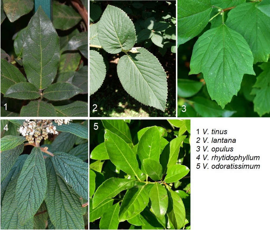 I viburni sono arbusti piuttosto comuni in città (ne ho contate almeno cinque specie), grandi e belli risultano particolarmente attraenti sia per i fiori, in ampi bouquet candidi, sia per i frutti, in vistose ombrelle reclinate e variamente colorate. Nel post li confronteremo nell’ordine: Viburnum tinus, V. lantana, V. opulus, (colla sua cultivar Flore Pleno in tutto uguale alla pianta madre tranne per la fioritura), V. rithidophyllum e V. odoratissimum (quest’ultimo sempre più noto nei vivai col nome V. lucidum). Le specie sono molto simili fra loro per chiome e fioritura, cosicché l’impresa potrebbe apparire difficilissima, ma vedremo che, per fortuna, potremo cavarcela già con l’osservazione delle sole foglie. E con ciò il post sarebbe già bell’e finito, ma noi dedicheremo le energie risparmiate per parlare di altri interessanti caratteri e goderci qualche immagine in più.