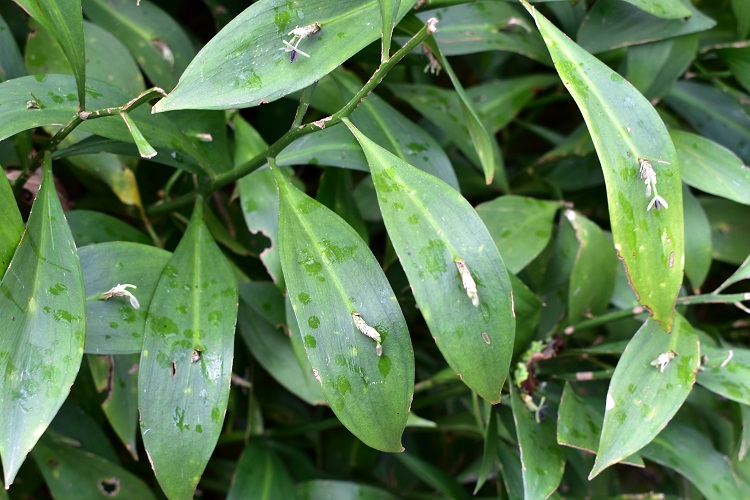 Ruscus hypoglossum(Erba bonifica). Le infiorescenze spuntano nel bel mezzo della foglia (che poi foglia non è ma rametto modificato)Tepali a tre a tre di forma e colore leggermente diversi. Antere fuse al sommo di una struttura viola (in realtà tre stili appiccicati).