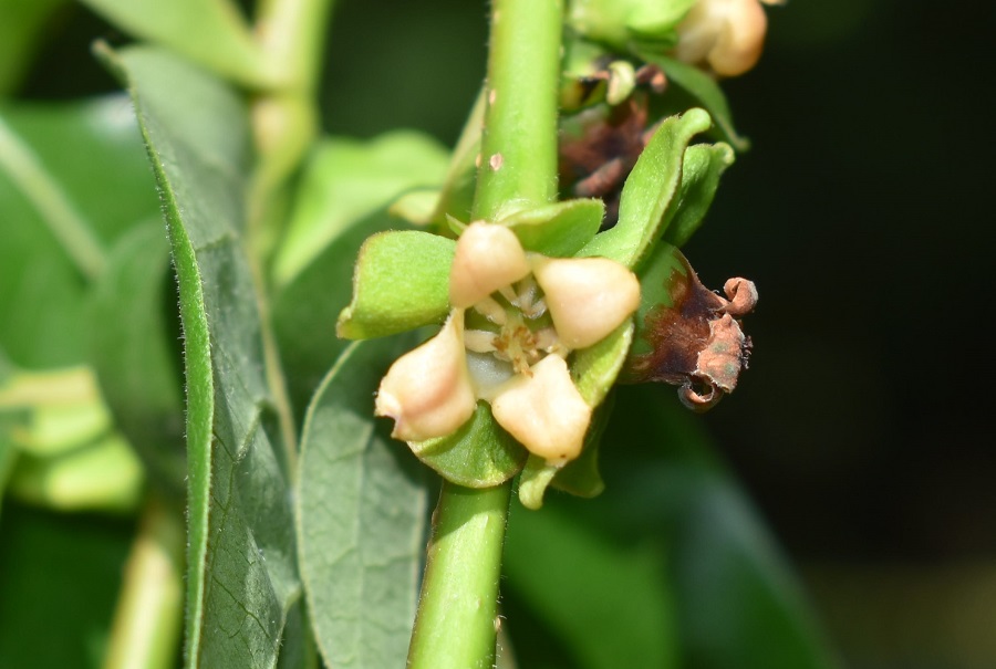 Diospyros lotus(Albero di Sant’Andrea). Fiori con quattro petali carnosi saldati alla base a formare un breve tubicino, sepali simili a quelli del cugino kaki, ma molto più piccoli.