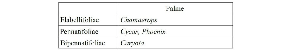 Gli ordini sono tre e si rifanno alle foglie. Tutte composte, ma nei modi più vari, potendo essere flabellate (a ventaglio), pennate (come certi pettini coi denti su entrambi i lati) e bipennate (due volte pennate).