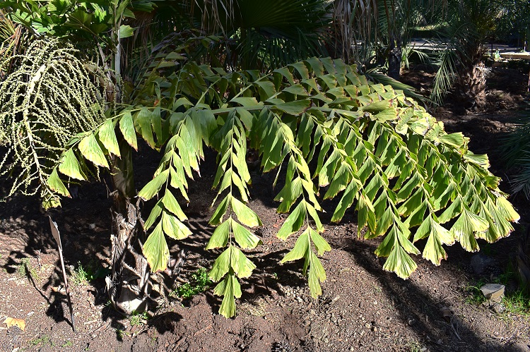 Caryota obtusa. Palma dalle incredibili foglie bipennateUn lungo rachide porta foglioline ben distanziate a loro volta composte da foglie opposte a lamina triangolare come tanti fazzolettini.