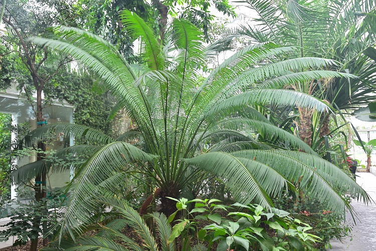 Cycas circinalis. Foglie lunghe e slanciate. Un rachide lungo e coriaceo porta attaccate quasi senza picciolo numerosissime fogliolinelucidissime, rigide, di colore verde intenso; disposte a mo’ di pettine.Phoenix dactylifera(Palma da datteri). Grande foglia pennata, il picciolo è ben visibile e armato con brevi e rade spine. Le foglioline sono piuttosto distanziate fra loro e il colore allude al glauco.Cocus nucifera(Palma da cocco). Foglie grandi dal lungo rachide, numerose foglioline sottili, lunghe, fittamente innestate.