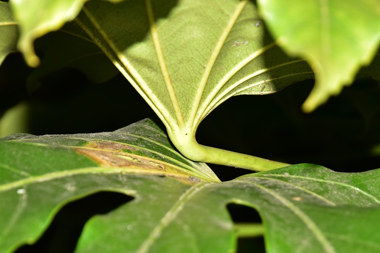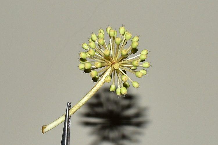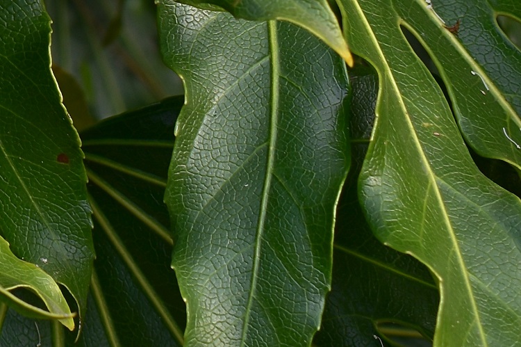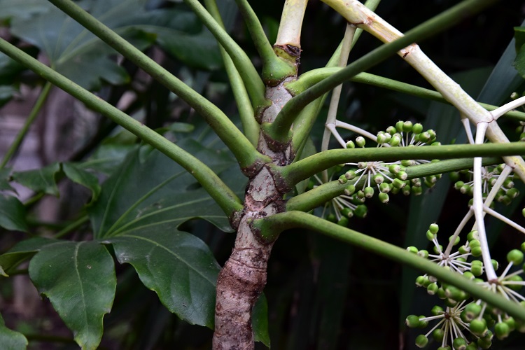 Rami che salgono rapidi direttamente dal terreno; pochi i rametti laterali, ma ci pensano le vaste foglie a dar corpo alla chioma, in specie alla sommità. Nella foto un esemplare al Lido di Venezia.Attaccatura delle foglie direttamente sui rami principaliPoi lasciano curiose e caratteristiche cicatrici fogliari direttamente culla corteccia.La quale corteccia è grigio chiaro, liscia e punteggiata di lenticelle. Via duca degli Abruzzi, uno scapigliato con tentativo di contenimento.Cresce anche in vaso, ma forse questo esemplare dell’Orto Botanico di Bologna non gradisce, o forse è sofferente perché la specie predilige l’ombra.Quando si incontrano esemplari rigogliosi, come questo in Via Raggio di Sole, si può ammirare il lavoro di foglie e piccioli che si ingegnano a formare una superficie compatta.Giovane e imbronciato esemplare in Via Tirana; qualcuno o qualcosa gli ha rotto l’unica infiorescenza che aveva emesso in questo inverno.E sono proprio le grandi foglie lobate (da sette a nove lobi) che colpiscono, anche per il curioso modo di incurvarsi del picciolo in prossimità dell’attaccatura. Si forma una sorta di calice rigato.Lunghi lobi divisi da stretti seni, che si inoltrano in profondità nella lamina fogliare terminando in curiosi occhielli. I lobi, sempre loro, sembrano sorretti da robuste nervature chiare convergenti verso il picciolo. Deboli le venature secondarie, reticolate le terziarie. Bordo rinforzato da un cordone giallastro e debolmente dentato.Ma è la fioritura che attira irresistibilmente l’attenzione: una incredibile struttura a pannocchia (grappolo di grappoli) ramificata in lunghi e radi steli… …che portano peduncoli con in cima grosse ombrelle sferiche. Bene si distingue la conformazione dell’ombrella alla caduta di petali e stami: raggi fulminei che si dipartono dritti da un unico punto posto al sommo del peduncolo. Una stella di rette direbbe un geometra (P. Odifreddi, Una via di fuga, Mondadori, 2011, p. 192).Una vecchia pubblicità di matite, per qualcun altro.Fiori a cinque petali bianchi e ripiegati all’indietro, alla schiusa di colore verde pallido e diritti; cinque stami dai lunghi filamenti candidi culminanti in minuscole antere, bianche anch’esse. Nettario ocra tenue, madido di gocciole zuccherate. Cinque stili culminanti in stigmi piatti.E cinque sono i loculi dell’ovario. Nella foto si distinguono le tracce degli ovuli sezionati trasversalmente e la materia circostante fornita dal ricettacolo, che diventerà la polpa della futura bacca.Frutti in gennaio. Poi, in maggio, le bacche maturando diventeranno viola scuro, e ricordano quelle dell’edera.Maturazione asincrona.Corteccia liscia e grigia, lenticelle munita e……con curiose tracce fogliari. Fa una certa impressione trovarle direttamente sui fusti, ma già sappiamo, per averlo notato più volte, che la pianta è priva di rametti lateraliUn estratto delle pagine 128 e 129 del volume di Thunberg. Indicazioni che ci possono servire da ripasso.Il foglio di erbario conservato al Kew Garden di Londra riporta ancora il vecchio nome.