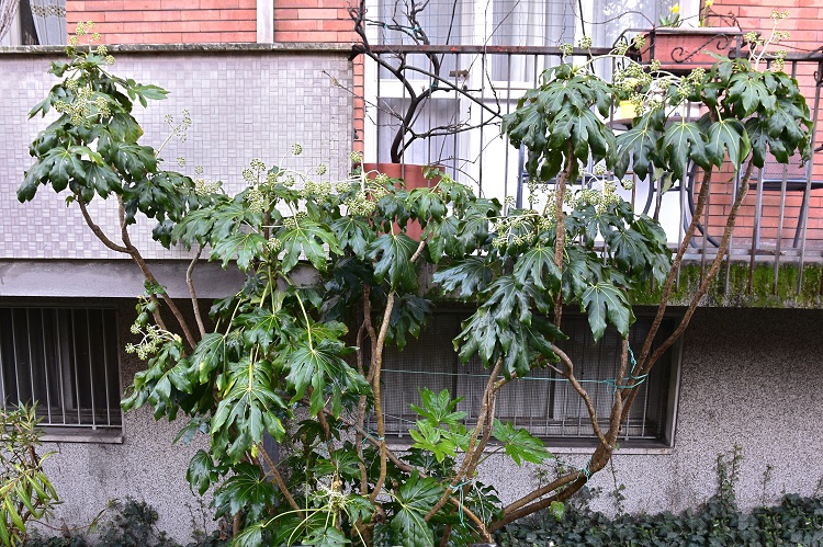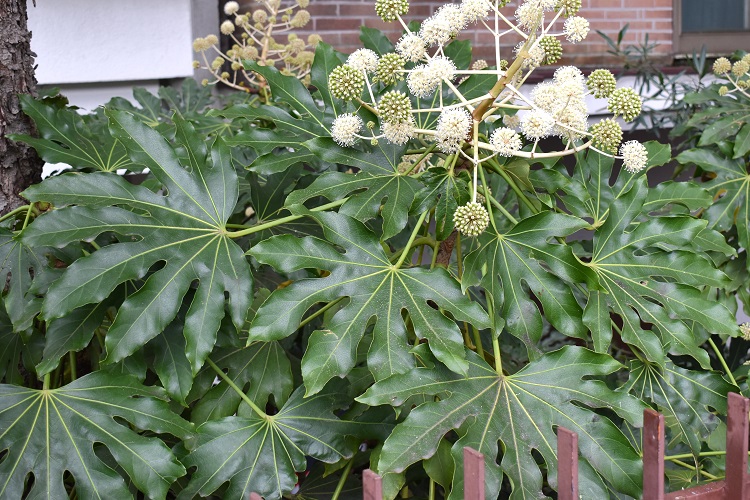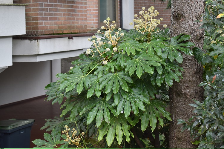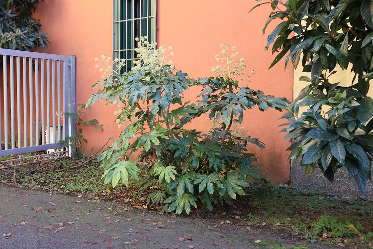 Fatsia japonica (Tunb.) Decne. & Planc. Nome imposto da Joseph Decaisne, naturalista belga che operò a Parigi, e da Jules É. Planchon, botanico francese cui si deve il salvataggio delle viti europee dalla fillossera. Purtroppo non ho trovato il numero della rivista, Revue Horticole, pubblicata a Parigi nel 1854 dove compare il nome assegnato dai due. In compenso posso esibire le pagine 128 e 129 del volume Flora japonica (1784) di Thunberg che riportano una descrizione minuziosa della pianta, alla quale egli aveva però attribuito il nome, oggi non più valido, di Aralia Japonica, e che attualmente, nella convenzione internazionale, designa un’altra specie. Entrambe, come c’era da aspettarsi, appartengono alla famiglia delle Araliaceae. (Approfondimenti)