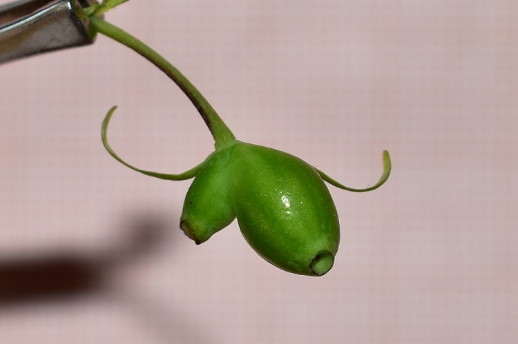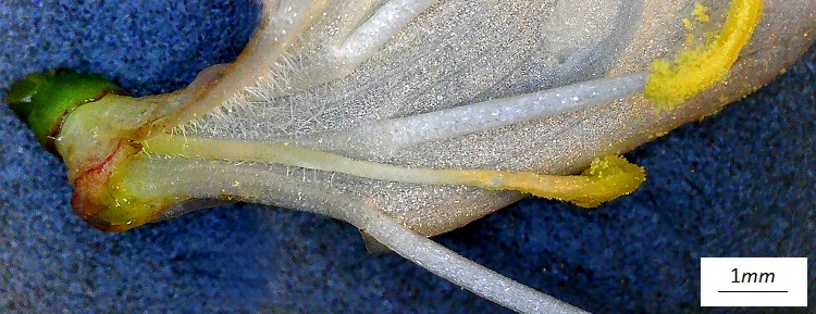 Orto Botanico di Padova. I numerosi rami salgono dritti direttamente dal terreno, poi in alto si aprono formando una chioma voluminosa. In un’aiuola in Via Tirana, con un aspetto un po’ più naturale per la presenza di rami bassi non asportati.I rami decombenti infoltiscono la chioma. Orto Botanico di Roma.In città non perde le foglie comportandosi da sempreverde. Nella foto l’esemplare dell’Orto in febbraio.In realtà in inverno sbiadiscono un poco. La forma è un ovale quasi perfetto, disposizione opposta e distica (stanno tutte su uno stesso piano)Breve picciolo, venature chiare, base acuta ma smussata, vertice arrotondato eppur munito di protuberanza appuntita.Dotata di un serissimo, ma inoffensivo, mucrone.Il bordo è intero, anche se leggerissimamente mosso. Passando il dito lungo il perimetro della foglia, nel verso vertice-base, si sente una leggera resistenza. Responsabili minutissime spine; ben visibili nell’ingrandimento.Pagina inferiore quasi glauca, nervature chiare.Queste ultime sono ricoperte da una fitta peluria bianca. Ma sarebbero necessari ben altri ingrandimenti per risolverla in singoli peli. Accontentiamoci di un primo piano delle spinette presenti anche lungo la nervatura principale.La fioritura comincia a metà febbraio e si protrae per tutto marzo. Intanto le foglie rinverdiscono di nuova linfa.E i nuovi rametti spiccano rossi sul verde erba delle neonate foglie.Fiori bianchi, appena venati di rosa, dalla fragranza fresca e mielata,… …compaiono timidi sui ramettia coppie (geminati). Cinque lunghi stami emergono dalle candide corolle.Simmetria bilaterale. Quattro petali appena attaccati fra loro compongono la parte alta della corolla, mentre uno unico più lungo, e ripiegato, completa la parte inferiore.Tutti sono attaccati fra loro terminando la corolla in un tubicino. Ma in fondo, proprio presso il calice (anche lui a imbuto) si forma una protuberanza: una sorta di sacca sempre colma di nettare per bombi e insetti di ogni sorta.Nella foto, levato il calice e sezionato l’ultimo tratto di corolla, si distinguono a sinistra la sacca, dalla parete arrossata, e al centro la parte terminale dello stilo immersa nel nettare. Bianchi peli diafani a guardia del tutto, forse per rallentare l’evaporazione.Ancora una sezione della corolla. Stami dai filamenti piantati nella parete interna, mentre lo stilo affonda nel calice sottostante (ovario infero).Stigma dall’incredibile colore dorato.I fiori nascono a coppie, come si è detto, e ben presto i calici (dopo la fecondazione) si accrescono inglobandosi l’un l’altro, mentre in cima terminano con cinque lobi appena accennati. Il breve peduncolo si biforca in due brattee protettive, le quali non sembrano curarsi troppo di questo compito ma paiono impegnate invece in eleganti movenze.Aperto il calice, appare l’ovario con perfetta placentazione centrale. I frutti sono bacche. La circostanza che siano saldate assieme, rende il caso interessante ponendoci difronte al più semplice di tutti i possibili frutti multipli. Insomma, una sorta di sorosio ricondotto ai minimi termini.A maturità: rosso, acquoso, spruzzato di pruina.Corteccia marrone chiaro, più scura in corrispondenza delle fessurazioni. Quanto alla forma, presenta lunghe placche sottili che si sollevano senza però aver molta fretta di cadere.