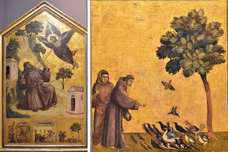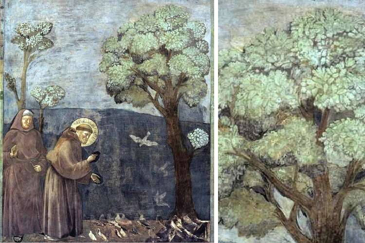 La Predica agli uccelli di Giotto della Basilica superiore di Assisi (1292-95) è forse, anche solo a considerare lo spazio dedicato agli alberi, il primo esempio di questo nuovo atteggiamento. L’intera parte destra è occupata da un grande esemplare, mentre altri due più piccoli, per ragioni prospettiche, sono collocati dall’artista al di sopra del Santo e del suo compagno. Gli uccelli in basso sembrano connettere le due parti.