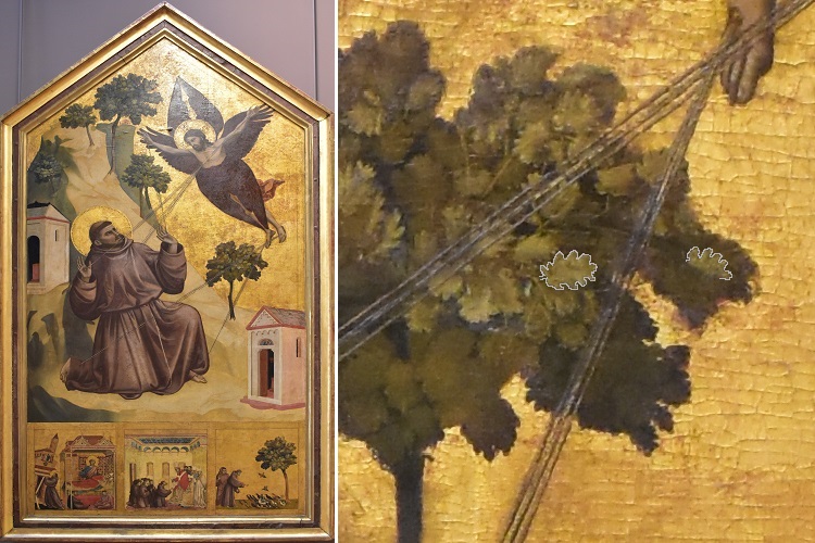 Una conferma indiretta viene dal terzo riquadro della predelladella tavola San Francesco riceve le stigmate del Louvre, 1297-99, dello stesso Giotto, dove il soggetto è ripreso identico, a meno dei due alberi in fondo, e con maggior cura dei particolari. Inutile ogni commento. Il problema è determinarne la specie.Forse ci aiuta la foglia, che si avvicina di più è quella della rovere: lamina fogliare che si allarga verso il vertice, lobi stretti e talvolta poco profondi, base acuta o smussata, picciolo corto.Tuttavia quanto all’aspetto viene da pensare alla roverella: tronco breve e contorto, chioma aperta e scapigliata.Nella scena principale della tavola compaiono ancora tre querce una è la pianta incorniciata dai raggi provenienti dai piedi di Gesù. Particolare a destra della foto.Altre due sono raffigurate al sommo del colle, anche se la più piccola, con quelle foglie esageratamente grandi, fa di tutto per assomigliare a un frassino.Gli altri due a mezza montagna potrebbero essere tigli.