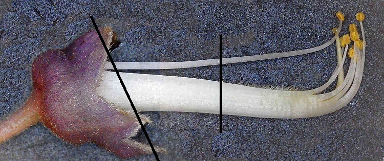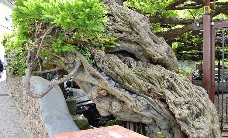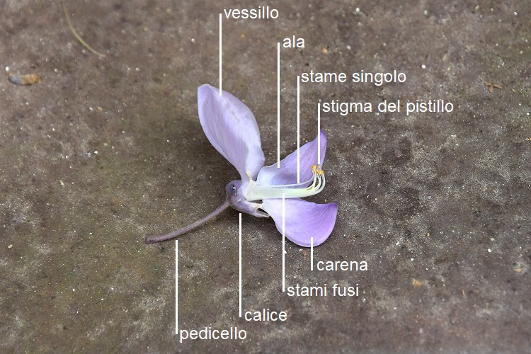 Via Cernaia, incredibile il numero di piante di glicine che si affacciano dal cornicione in questo tratto di mura, che in aprile si colora di violetto.Giovani virgulti, pronti a tutte le necessità dei giardinieri padovani (di ogni età e genere), al mercato del sabato in Prato della Valle.La specie è un’abile arrampicatrice. Nella foto una incredibile scalata – siamo lungo il Brenta, presso Limena. Come spesso accade la foto non rende.Cortile di Palazzo Zuckermann, l’abito invernale mostra bene la tecnica che adotta per inerpicarsi. Ed ecco i nutriti grappoli in una eccezionale gradazione di viola. L’elegante persiana sullo sfondo è di un edificio dell’Orto Botanico di Torino, un posto che merita una gita. (Foto di Giuliana Z.)Le sfumature dei colori sembrano artefatte, ma, a parte la mediazione di lenti, pixel e quant’altro, è tutto ‘vero’.Infiorescenza in boccioPoco dopo, il grappolo si distende. Ogni fiore è protetto da brattee diafane.L’infiorescenza, come si è detto, è un grappolo, mentre il singolo fiore ha forma papilionacea. Il colore non è affatto uniforme, poiché il vessillo ha pagina interna molto chiara, caratteristica grandemente accentuata da striature giallo oro verso l’attaccatura. Sono i petali della carena e delle ali, che fanno emergere il colore viola più intenso.Nella foto la corolla smontata. Le unghie sono sottilissime, ma non per il vessillo. Per far emergere stami e pistillo basta pizzicare la carena e spingerla verso il basso. Gli stami sono dieci, nove dei quali saldati fra loroe uno libero (diadelfi); del pistillo, imprigionato, emerge solo lo stigma a capocchia di spillo. Incontro ravvicinato. A sinistra il calice dai vividi colori; separato, lo stame singolo; del pistillo si distingue parte dello stilo (giallognolo) e lo stigma ambrato – i peli sono dell’ovario; giallissime le antere.Tolta la guaina, formata dai filamenti saldati, appare l’ovario peloso. Il frutto sarà un baccello.Sezione longitudinale della guainaLa struttura del fiore è affascinante, tanto che vale la pena disegnarne il diagramma fiorale. I cerchi concentrici sono, per convenzione, le tracce lasciate dalle diverse sezioni, nell’ordine: calice, corolla, antere, ovario.In figura i diversi piani utilizzati. Nel caso degli stami si bara un po’ giustapponendo bellamente le sezioni delle antere.Le strane evoluzioni dello stame libero lì dove si attacca al ricettacolo. Per fare la foto ho spellato il calice.Ovuli.I frutti sono baccelli vellutati (ricordate l’ovario peloso?) Foto in agosto.Pendono tutti assieme come salumi. Ogni grappolo ne produce uno o due.A maturazione diventano marrone. Anche i semi all’interno hanno lo stesso colore, la forma è di piccoli dischi.Nella foto si riconoscono l’ilo, la macchia biancastra al centro, la buccia leggermente maculata, l’endosperma marrone chiaro, con macchioline scure, e i cotiledoni giallini.L’embrione è diritto e fornito di plumula; a sinistra la radichetta. La macchia al centro è la cicatrice di uno dei cotiledoni asportati.Con un po’ di fantasia, e tanta buona volontà, si distinguono le due foglie composte che ricoprono la regione apicale.È una pianta che non si fa mancare proprio niente: anche il foliage è accattivante. In questa foto, in Via Monte Grappa, l’ospite è un ligustro giapponese variegato. Le foglie diventano giallo ocra.Queste poi sono composte, imparipennate e a disposizione alterna. Il colore verde leggero è ancora più tenue al risveglio vegetativo, e resta tale per tutti i mesi primaverili.Il numero di foglioline è sempre contenuto: da quattro a sei coppie, molto raramente di più. Picciolo proporzionato con guaina piuttosto ingrossata; piccioletti cortissimi.Foglioline allungate con base acuta e apice aguzzo. Nervature dritte, parallele e leggermente infossate. Bordo intero.Pagina inferiore più pallida e nervature a sbalzo.Corteccia con piccole e fitte rughe, colore bruno grigiastro. I diversi rami tendono ad attorcigliarsi e accavallarsi l’un l’altro.I manuali non ne parlano, ma a me sembra che la pianta sia longeva, avendo incontrato non pochi vegliardi dall’aspetto massiccio. Nella foto Via S. Trinità a Ravello; il soggetto dell’haiku iniziale. Prato della Valle a Padova.Un vecchio glicine in uno dei tanti cortili dei palazzi del centro storico di Napoli (forse Via Benedetto Croce). Di questa pianta abbiamo già mostrato la corteccia qualche foto più in dietro. Immancabile nelle ville di rango la composizione a lunghi viali. Nella foto Villa Pisani a Stra (VE), in fondo si intravvede l’Esedra.Villa d’Este, Tivoli.
