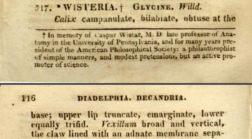 Etimologia Il nome del genere fu imposto da Thomas Nuttal, biologo statunitense, a pagina 115 del volume The genera of Nord America plants, 1818. Egli lo volle dedicare a Caspar Wistar, medico e professore di anatomia all’Università della Pensilvania. Doveva amarlo molto a giudicare dalle belle parole con cui volle descrivere l’uomo. (A questi link troverete una incisiva biografia del Wistar). Forse sarebbe stato più appropriato che Nattal avesse usato il termine Wistaria con la ‘a’, ma tant’è.