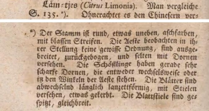 La pagina 250 dell’edizione del 1765. Citrus limonia è denominata la specie. Nel testo compaiono solo amenità sulla vendita di limonata agli equipaggi europei, ma in nota sono descritti alcuni caratteri (corteccia, foglie e spine), tutte cose che ritroveremo in seguito. Personalmente trovo misteriosa l’attribuzione della paternità a questo libro poiché la descrizione di Linneo mi sembra appropriata; forse qualcosa mi sfugge.