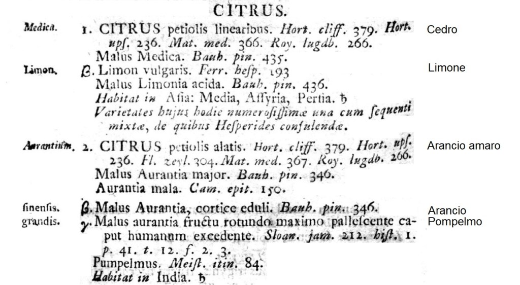 Le pagine 782-83 di Species Plantarum. Linneo individua due grandi filoni per il genere Citrus legati alla presenza o meno di ali sul picciolo. Da una parte C. Medica (Cedro), con picciolo non alato, una cui varietà è C. limon. Dall’altra l’arancio amaro (Citrus aurantium), dal picciolo alato, con due varietà: l’arancio (C. sinensis) e il pompelmo (C. grandis). Linneo dixit.