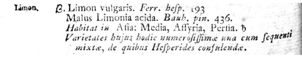 Limon vulgaris lo diceva Giovanni Battista Ferrari nel suo Hesperides siue de malorum aureorum del 1646, mentre Gaspard Bauhin lo chiamava Malus Limonia acida. Poi segue una interessante postilla dove si specifica che esistono a tutt’oggi numerosissime varietà e loro incroci. Segno che la coltivazione di questa pianta in occidente era praticata ormai da tempo.