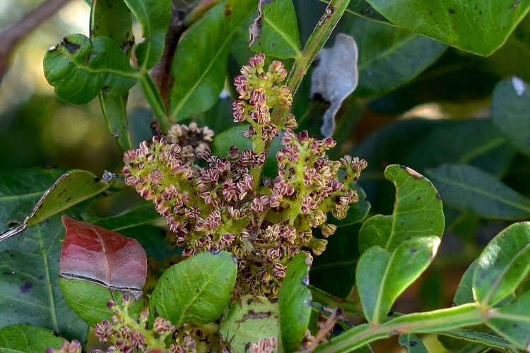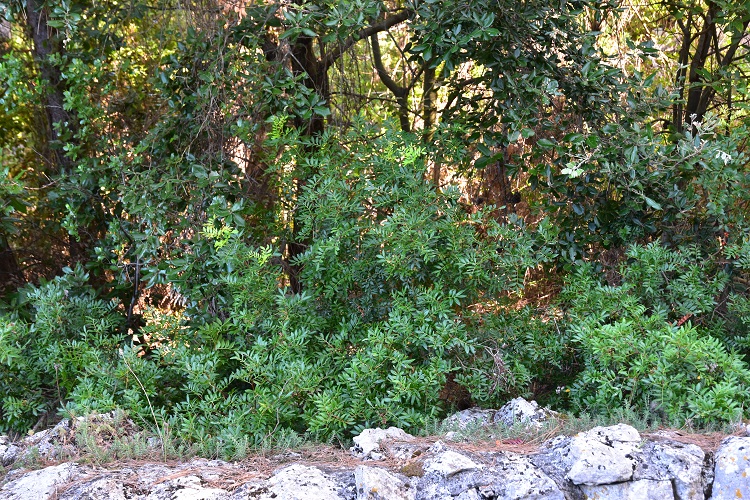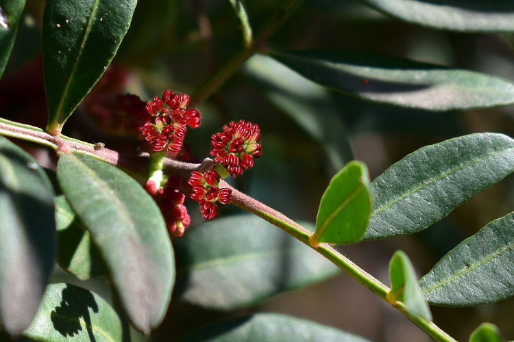 In una foto di luglio, persi i fiori, si distingue meglio la struttura dell’infiorescenza: un grappolo con asse rigido e fiori sessili.Quando si schiudono le sacche polliniche il tutto si scolora.L’infiorescenza femminile è più intelligibile: l’asse si distingue più chiaramente e la collocazione dei singoli fioretti appare più decifrabile.Anche in questo caso il fiore è nudo, ma si mostra una stipola protettiva. Un brevissimo peduncolo sorregge il pistillo dall’ovario pressoché sferico e lo stigma trifido.Lo stilo manca. A volte i colori sono più accesi e lo stigma è scarlatto. Una sola cavità per un solo ovulo.Il frutto è una piccola drupa rossa a fine estate, poi diventa nero violacea a maturazione in inverno.Da giovane la corteccia è liscia e di uno strano colore violaceo misto al grigio; numerose lenticelle.L’albero è longevo, da vecchio la corteccia diventa decisamente grigia e si fessura in placche irregolari aderenti ai tessuti sottostanti. Nella foto vecchio lentisco dell’Orto Botanico di Napoli.Real Giardin Botanico di Cordova, un altro vegliardoSentiero per Erchie (Maiori – Salerno), in secondo piano un carrubo.