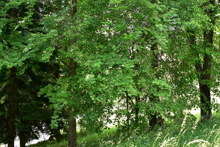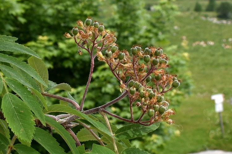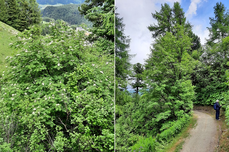 Giovane aucuparia, come uscito da un manuale. Caserma Forestale del Gariglione, Sila Piccola.Piana di Marcesina, Altipiano di Asiago. Rami sottili e lanciati verso l’alto. Quelli che sembrano rifiuti abbandonati, nel prato al limite del bosco, sono ceppaie lasciate da Vaia.Sorbi degli uccellatori in fiore, sentiero Heidi, S. Moritz.Foglia composta imparipennata, rachide dal breve picciolo; foglioline allungate, vertice acuto e base ottusa, bordo dentato con denti regolari e spesso doppi.Piccioletto assente. Il colore è verde brillante e le venature sono ben visibili… …fino alle terziarie, che han struttura reticolata. Pagina inferiore con modesta peluria lungo le venature. Il rachide arrossa in autunno.Infiorescenze a grandi corimbi di piccoli fiori bianchi con riflessi crema.Nella foto si distingue bene l’articolazione dell’infiorescenza Cinque petali circolari ben separati fra loro, numerosi stami (venti, un multiplo dei petali); antere, montate su lunghi filamenti, giallissime all’inizio poi si scuriscono alquanto; nettario giallo ocra. Cinque lobi si staccano dal calice infilandosi fra i petali. Tre pistilli emergono da fitta peluria: stili mossi di colore giallastro, sormontati da stigmi piatti, anch’essi ocra.Calice a foggia di cono, diffusa peluria all’esterno e (come già detto) all’interno; colore verde alla base, giallo alla sommità, ma i cinque lobi sono verdi. Petali bianchi a mo’ di ciotoline circolari; unghia sottile e breve.Incontro ravvicinato con stigmi e stiliOvario infero, un solo alloggiamento e un unico ovulo.Frutti, pomi con un solo seme. In giugno sono già formati, ma il colore è ancora verde. L’infruttescenza ripete la forma (a corimbo) dell’infiorescenza.A maturità (in settembre) assumono un bel colore rosso aranciato. Nel frattempo l’infruttescenza si è ripiegata all’ingiù. In genere è difficile distinguerlo dal fratello domestica (foglie e fiori hanno differenze minime) ma in presenza dei frutti l’operazione è facilitata.Anche la corteccia aiuta, anzi direi che è l’unica risorsa in assenza dei frutti. L’aucuparia l’ha liscia e lucida mentre quella del domestica è opaca e si screpola prestissimo in placche. Il colore va dal grigio bruno al rossastro, ma è la lucentezza la sua vera cifra. Come per tutte le cortecce lisce, lei è sottile. La ferita su questo esemplare dà l’opportunità di valutare lo spessore del ritidoma accartocciato.Gemma rossiccia e mai vischiosa, nere quelle lungo i rametti.Camigliatello, Sila Piccola. Non solo cresce spontaneo, ma le persone, in ogni dove, amano metterlo a dimora attorno alle abitazioni. In autunno i frutti sono molto decorativi, anche il foliage è attraente: diventa giallissimo, talvolta rosso.Anche Mario Rigoni Stern ne ha uno nel suo brolo in Asiago.La Chiesa Bianca di Maloja (Engadina, Svizzera), il paese che Segantini scelse come sua dimora. Ne ritrasse le montagne da ogni angolazione e con la più diversa luce. Il sorbo addossato alla facciata della piccola chiesa ha portamento arbustivo ma dimensioni non trascurabili.L’alta valle dell’Inn da S. Moritz fino a Maloja, vista dal massiccio del Muragl dove il pittore aveva il suo bivacco personale (Chamanna Segantini).Foce del Clyde (Scozia), un giovanotto fra cuscini di Ulex europaeus.Non molto lontano in cima al monte Goatfell, Isola di Arran, un vecchietto cresciuto di stenti.