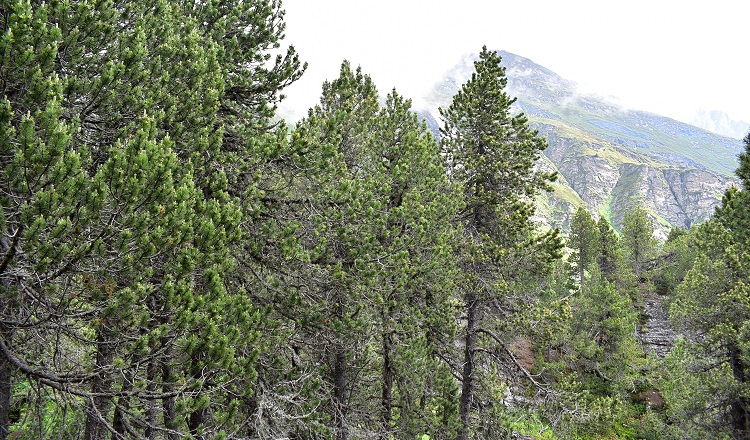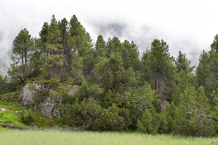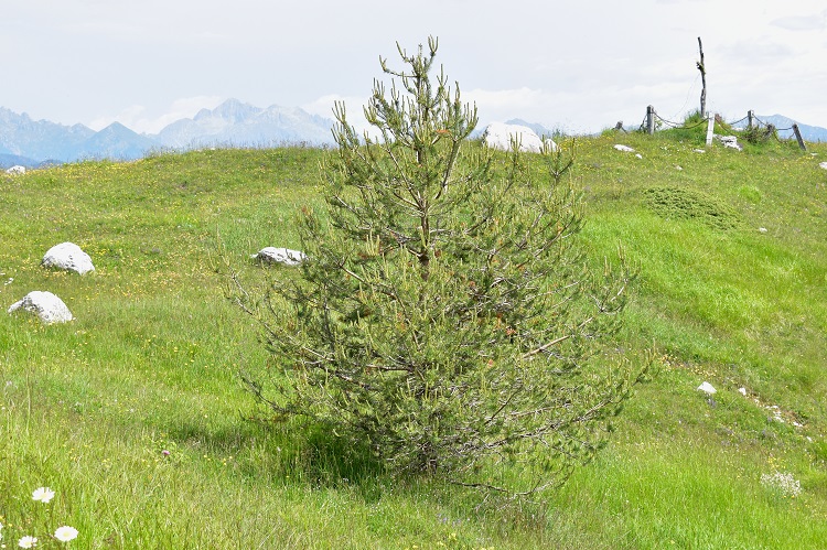 Un vecchio mugo veglia sulla tomba del pittore Giovanni Segantini nel cimitero di Maloja. Il paese che l’artista scelse come residenza elettiva. Le montagne che ha amato tanto e che ha ritratto sotto le più diverse prospettive e ogni luce possibile. Nella foto da sinistra Piz Albana e Piz Julier viste dalla riva est del lago di S. Moritz, più in basso l’edificio con la cupola appuntita che ospita il museo dedicato al pittore.G. Segantini, Pascoli di primavera, 1896, BreraParticolare. Potrebbe essere un mugo, ma più probabilmente un cembro.Sì, forse un giovanissimo cembro.