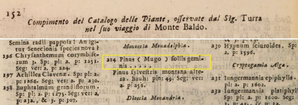 Pinus mugo Turra Nome imposto da Antonio Turra in Giornale d’Italia: Spettante alla scienza naturale, e principalmente all’ agricoltura, alle arti, ed al commercio, N. 19 del 10 Novembre 1674, p. 152, Venezia, 1765. Il Turra vicentino e suddito della Serenissima fu medico e naturalista. Concluse la sua carriera come editore in Venezia. La specie ha molte sottospecie (almeno due importanti), troppe per un misero post. Rimando chi fosse interessato al sito di Kew.