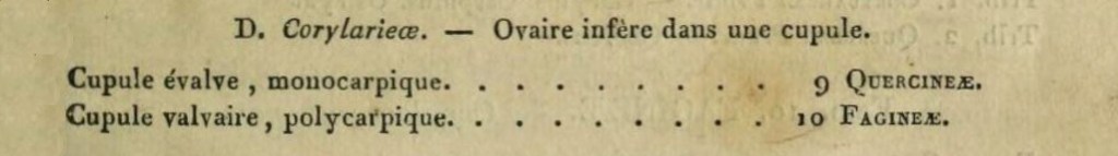La pagina 11 dell’Analyse. Dumortier individua l’ordo (raggruppamento collocato gerarchicamente appena sopra le famiglie, l’equivalente dei nostri ordini) delle Corylarieae caratterizzato da ‘ovario infero racchiuso in una cupola’. L’ordo comprende due famiglie, le Quercineae contraddistinte da ‘una cupola senza valve e con un solo frutto dentro’, e le Fagineae (oggi Fagaceae) contrassegnate da ‘una cupola con valve e dentro più frutti’.
