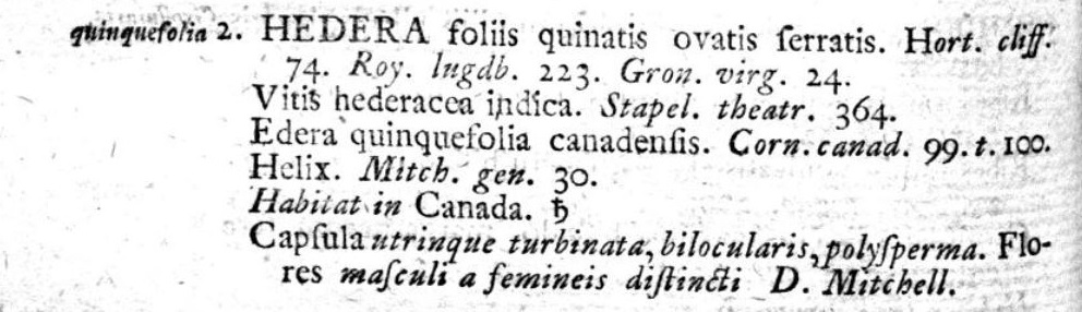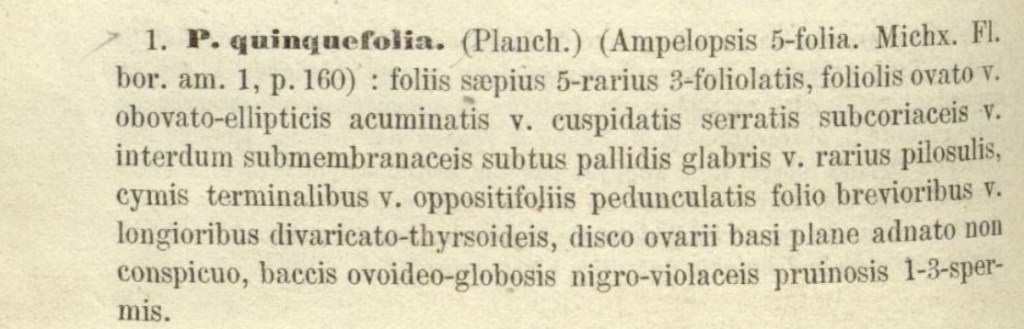 1La pianta era stata classificata come una Ampelopsis da André Michaux in Flora Boreali Americana, il quale l’aveva a sua volta spostata dal genere Hedera assegnatole nientemeno che da Linneo; e del binomio di Linneo è rimasto l’epiteto quinquefolia.