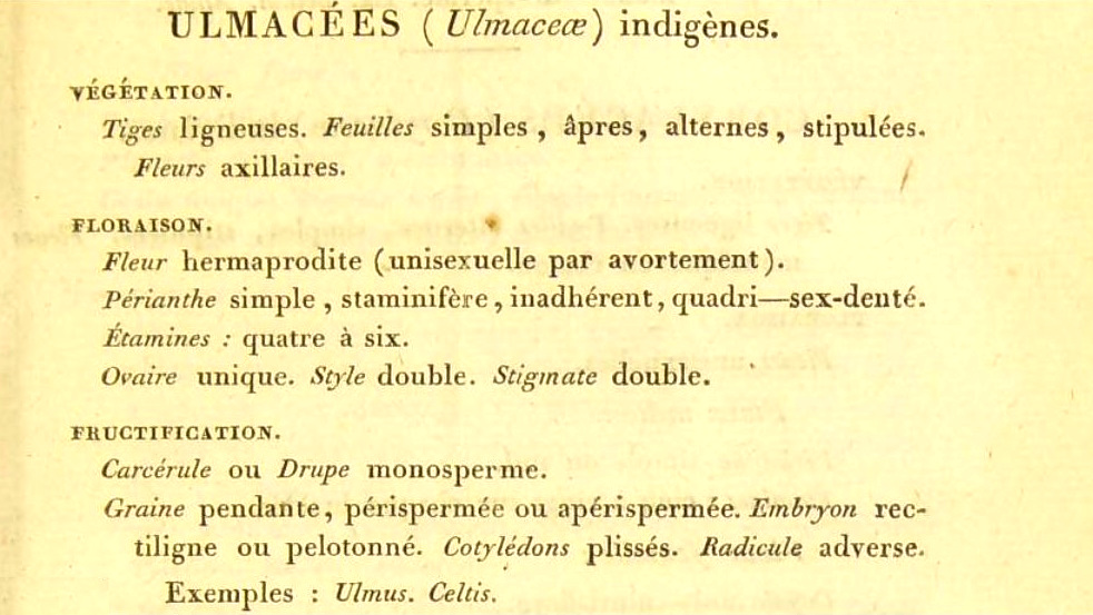 La pagina 905 degli Elemens. Mirbel elenca i caratteri salienti della famiglia: perianzio semplice (un solo involucro fiorale non distinto in calice e corolla) da quattro a sei denti; stami da quattro a sei; ovario unico, due stili e due stigmi (insomma, pistillo formato da due carpelli). Le foglie sono semplici, alterne e con stipole (‘apres’ = forse spuntano dopo i fiori); non fa alcun riferimento all’asimmetria che pure è una delle cifre della famiglia. Dei frutti ci dice che possono essere ‘carcerule’ (frutto semplice che resta chiuso) o drupe ad un solo seme; stranamente non c’è riferimento alla samara dell’olmo. Tra i generi ricordati compaiono olmi e bagolari, ma mancano le zelkove; per capirne il motivo conviene costruirsi una linea del tempo.