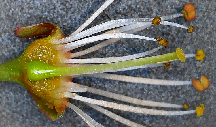 Fiore di melo, si sono tolti tutti i petali; l’ovario è dentro il ricettacolo. Spesso nel caso di ovario infero si ha questa configurazione per gli stami.
