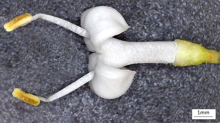 Fiore di Berberis vulgaris, per poter osservare dove si attaccano gli stami è bastato togliere un paio di petali.