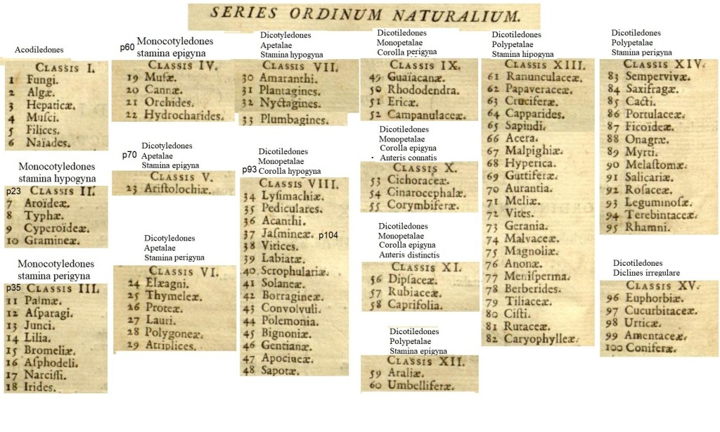 Formate le classi il nostro eroe può procedere secondo il metodo ‘naturale’ e riunire i generi in famiglie – in contrapposizione al metodo ‘artificiale’ di Linneo che formate le classi cominciava a contare i pistilli. Ottiene in tutto cento famiglie distribuite tra le quindici classi: sei per la prima, quattro per la seconda,…