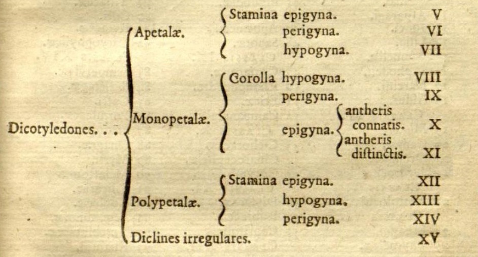 Quest’ultimo dà la XV classe (senza ulteriori specificazioni), mentre per i primi tre si riprende con le posizioni relative tra attaccature degli stami (o della corolla per le monopetale) e ovario. Si ottengono così, secondo lo schema in figura, le restanti classi dalla V alla XIV, essendo, ricordiamolo, la XV coincidente con le piante con fiori a sessi separati.