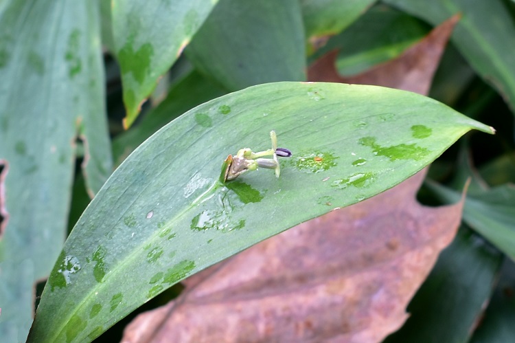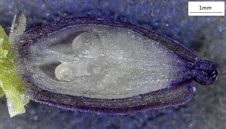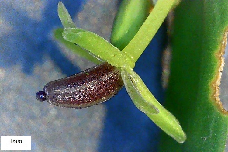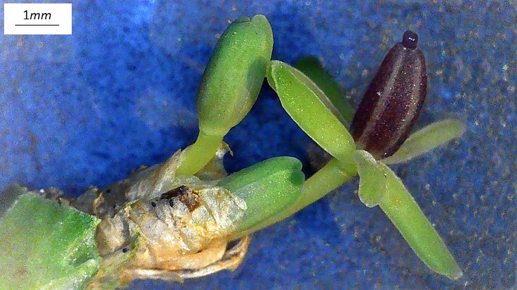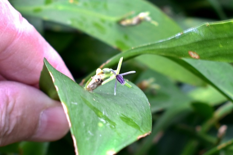 Pianta dioica (fiori maschili e femminili su individui diversi – Linneo avrebbe detto: marito e moglie vivono in case separate).L’infiorescenze è un mazzolino di pochissimi e piccolissimi fiori che da lontano appaiono bicolori: verde fioco e viola acceso.Il fiore (all’aspetto uguale nei due sessi) ha sei tepali lunghi e stretti. Tre più grandi disposti secondo angoli di 120 gradi di colore verde pallido, e tre lungo le bisettrici di un viola molto tenue. Li sormonta una struttura viola culminante, nei fiori femminili, in uno stigma blu notte che sembra una pallina giustapposta,… …in quelli maschili da antere bianche un po’ mosse. La piccola infiorescenza. Si distinguono due boccioli, un fiore femminile e un complesso di squamette protettive cartacee.Fiore femminile, si riconosce lo stigma a bottoncino. La struttura viola è formata da tre (?) filamenti di antere abortite (staminodi) saldate fra loro. Il peduncolo è piuttosto lungo (relativamente alle dimensioni del tutto).Da diversa prospettiva. Si riaccendono i dubbi sul numero di filamenti saldati, sembrano sei come i tepali.La struttura viola smontata. In basso il pistillo coll’ovario allungato, il breve stilo e il curioso stigma.