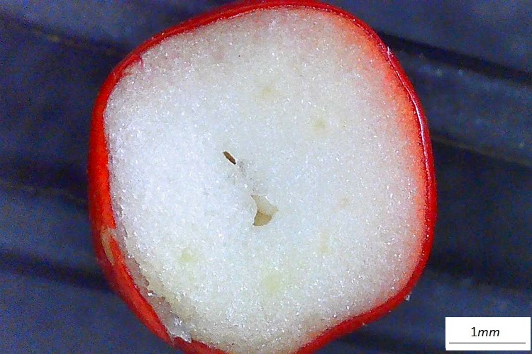 Pianta non molto efficiente nel produrre frutti (la sferetta rossa al centro), in compenso si propaga con facilità per via vegetativa.Il frutto è una bacca scarlatta. Sferica o allungata. Conserva quasi tutto dell’infiorescenza.Si riconoscono resti di stilo e stigma, dalla parte opposta vestigia di sepali e, seminascosti, avanzi rinsecchiti di staminodi.Sezione trasversale del frutto. Una bacca.