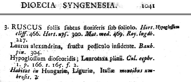 La pagina 1041. Linneo appunta l’attenzione sui fiori che spuntano sotto una fogliolina. Uno strano comportamento che non tralasceremo di documentare. Seguono i consueti riferimenti a numerose sue opere precedenti, e poi altri nomi esotici: Lauro alessandrino dato da Bauhin; due assegnati da Fabio Colonna: Ipoglosso di Dioscoride e Laurotasso di Plinio. Pianta collocata nella terribile classe delle Dioecia Syngenesia: dioica e con le antere saldate tra loro. Mentre per Jussieu è prima di tutto una monocotiledone con stami perigini. La famiglia è delle ‘Asparagi’; e fra le Asparagaceae Juss. si trova tuttora.
