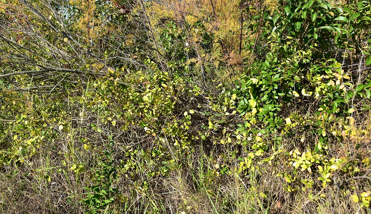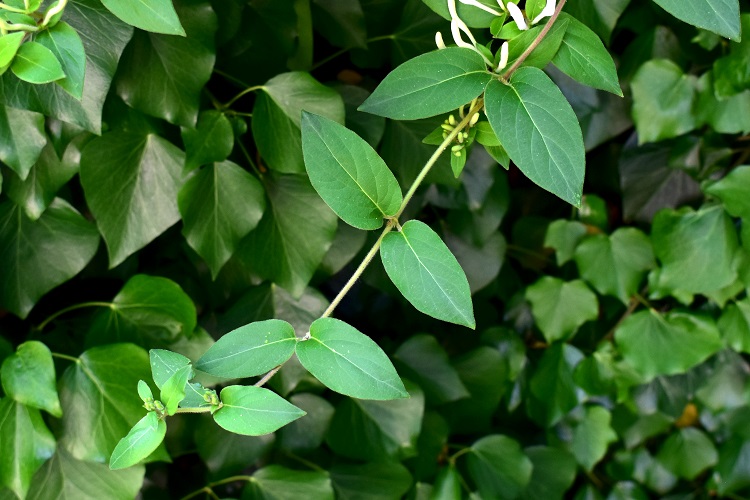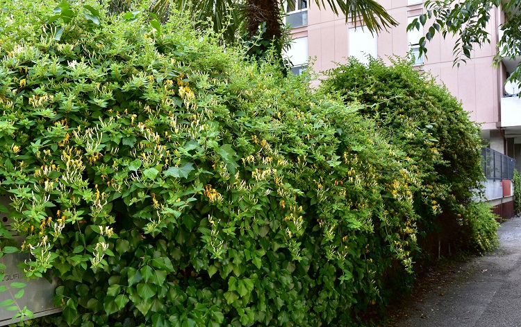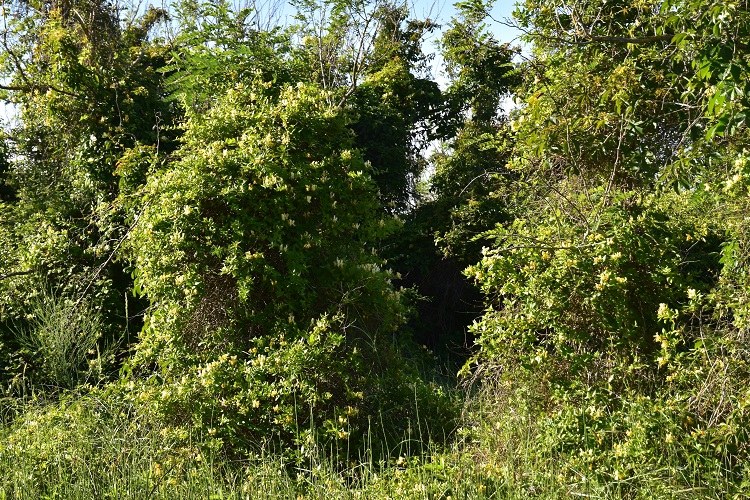 Caprifoglio a carattere lianoso. Robusto e vitale, si inerpica sugli alberi, anche a grandi altezze, con facilità e senza alcun bisogno di radici aeree; in mancanze di supporti dilaga sul terreno formando un tappeto verde, più o meno scuro a seconda della stagione. Da maggio a settembre si accende di fiori bianchi e gialli. Proviene dall’estremo oriente e si è completamente naturalizzato.