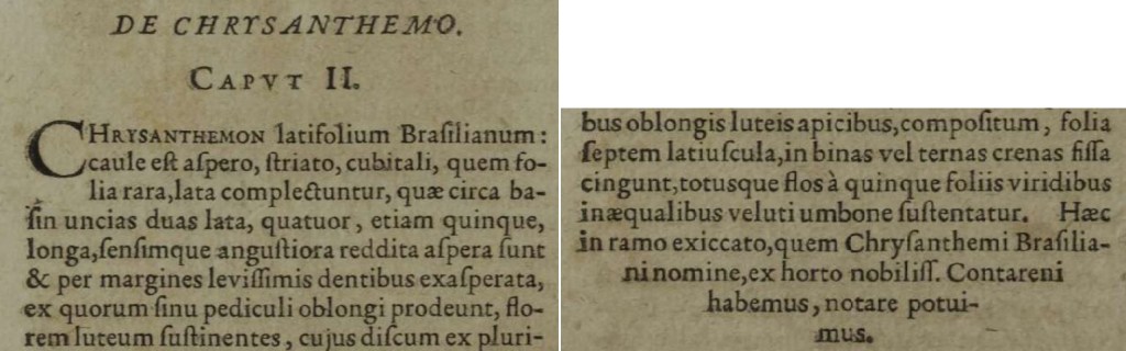 La pagina 905. Foglie ovate cordate, nervature che si uniscono sulla lamina. Linneo sbaglia il paese di provenienza, errore che eredita da Garspard Bauhin, che a pagina 70 dei suoi Prodromos Theatri Botanici, Basilea, 1671, lo chiama Chrysanthemum latifolium brasilianum. Ho riportato alla fine del post la descrizione di Bauhin.