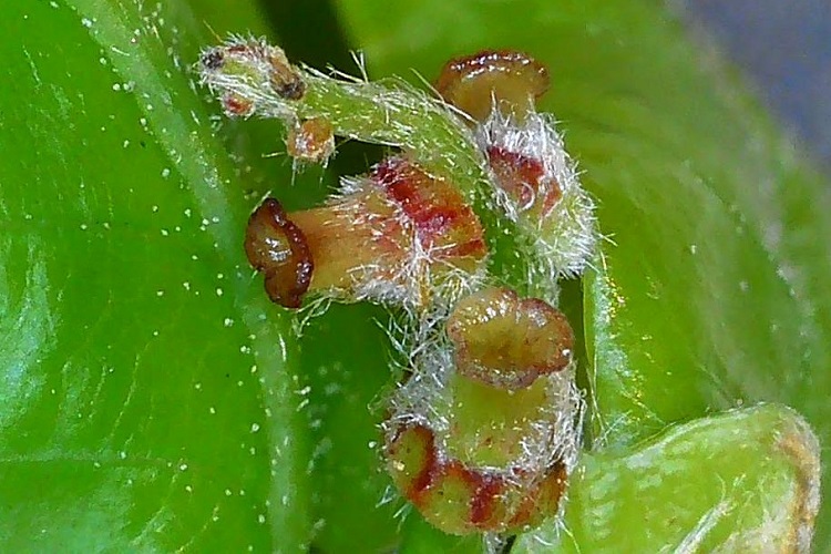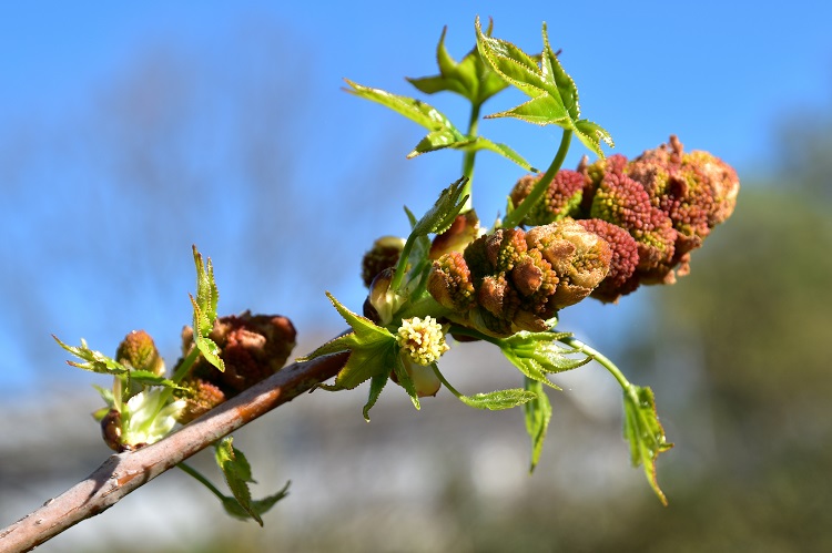 Bagolari (Celtis) – Infiorescenza a mazzolino. I fiori maschili sono alla base e quelli femminili o bisessuali in cima, dunque pianta poligama. Nella foto Celtis australis.
