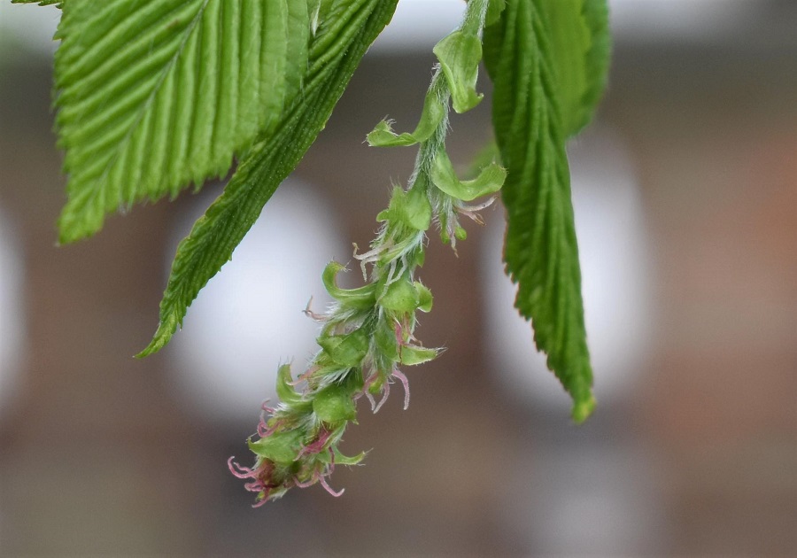 Carpini – Fiori maschili in lunghi amenti gialli, fiori femminili in amenti più corti e verdi. I singoli fiori sono protetti da una fogliolina o squama. Nella foto amenti femminili di Carpinus betulus.
