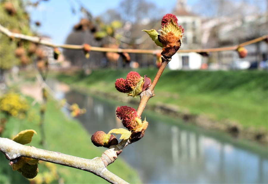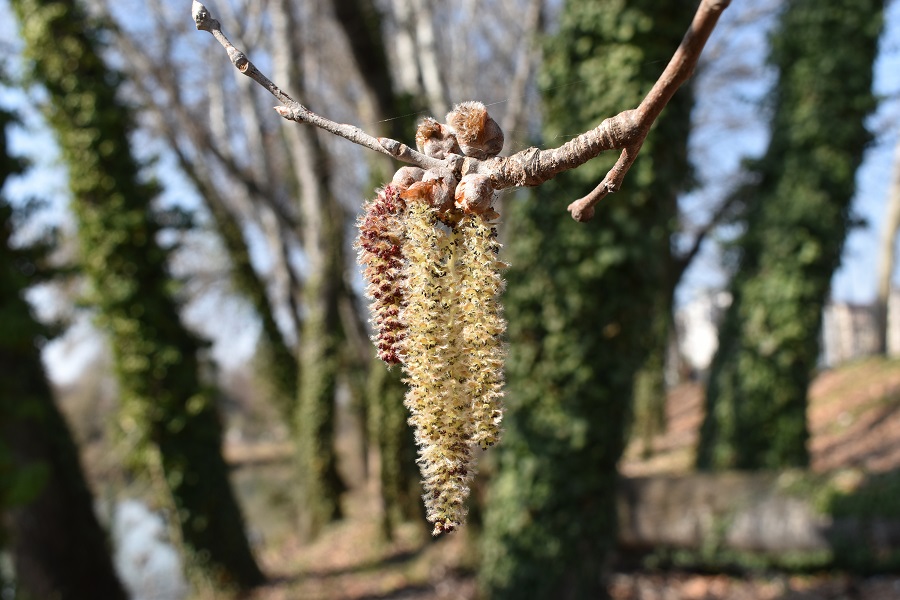 Pioppi – Amenti maschili inizialmente rossi maturando si allungano e ingialliscono, singoli fiori protetti da una squama sfrangiata, stami con numerosi filamenti distinti. Nella foto Populus nigra.
