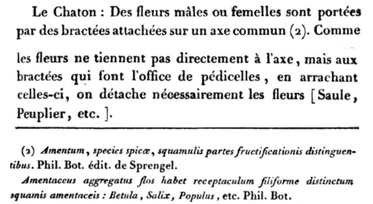 Il termine oggi ha significato profondamente diverso: ‘[esso] si riferisce a qualsiasi tipo di infiorescenza allungata composta da numerosi fiori poco vistosi […] Questo termine è generico e non tiene conto degli ordini di ramificazione […] gli amenti possono essere semplici o composti.’, Judd et al., Botanica Sistematica, Piccin, 2019, pag. 86 – il corsivo è mio. Con conseguenze devastanti sul suo valore tassonomico, e infatti oggi non ne ha alcuno. L’analisi attenta del termine fornisce un bell’esempio di come la storia della scienza aiuti la comprensione di fenomeni e teorie.