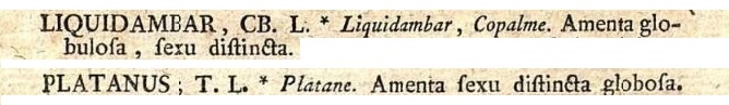 3Quando Jussieu descrive i generi platani e liquidambar indica le infiorescenze come ‘amenti globosi’ , locuzione mai usata allorché elenca i caratteri delle Amentaceae.